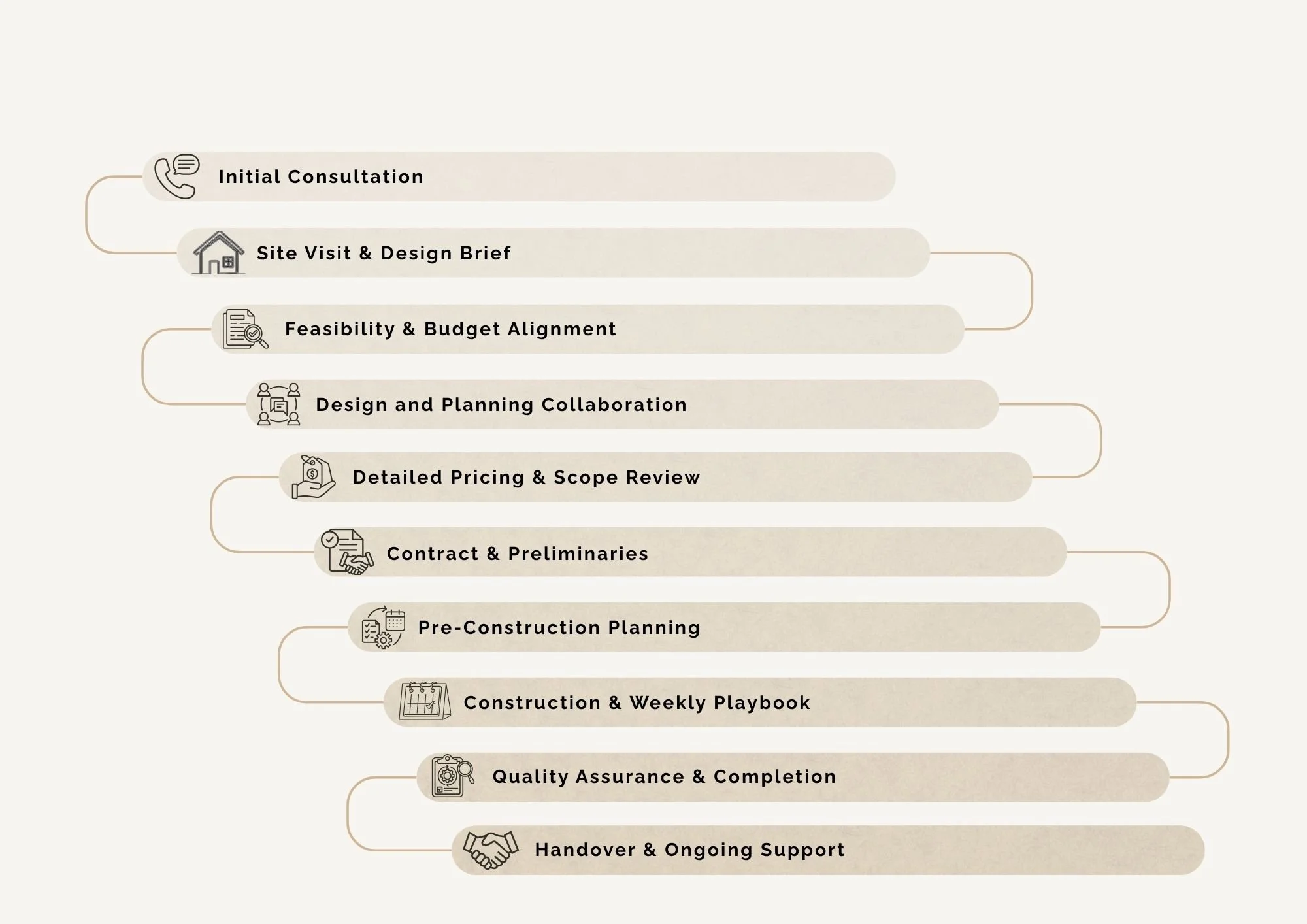 We manage the entire process so you don’t have to coordinate trades, chase updates, or make constant decisions without guidance. This pathway is designed to enhance our client experience from the start. It ensures you know the what, the when, the who and the how from Day 1